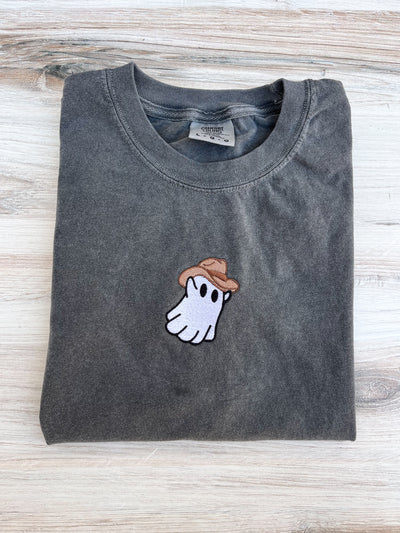 Cowboy Ghost Comfort Colors Tee, Halloween Embroidered Tee, Fall T-Shirt, Spooky Season Shirt, Embroidered Tee, Western Ghost Shirt, Cowboy