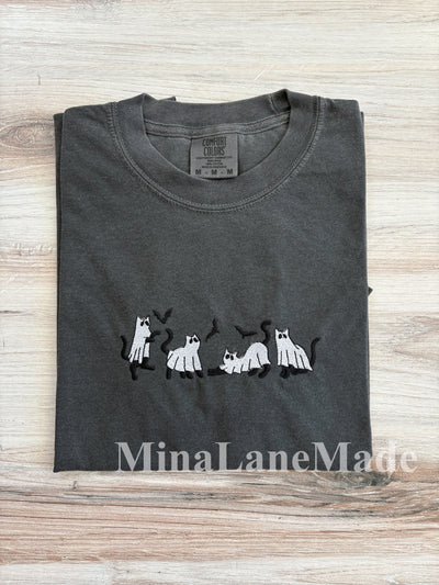 Cat Comfort Colors Tee, Halloween Embroidered Tee, Fall T-Shirt, Spooky Season, Embroidered Tee, Cat Ghost Embroidered Shirt, Spooky Shirt (Copy)